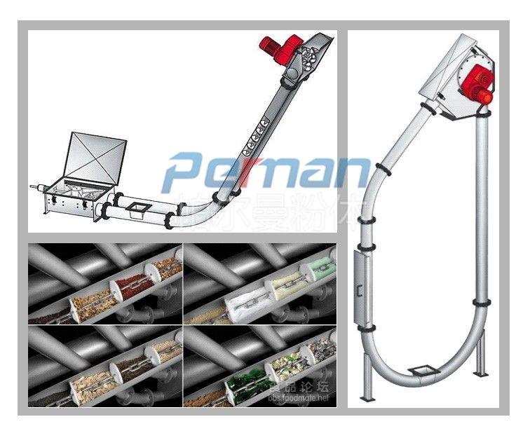 在密閉管道內,以鏈片為傳動構件帶動物料沿管道運動。當水平輸送時,物料顆粒受到鏈片在運動方向的推力。當料層間的內摩擦力大于物料與管壁的外摩擦力時,物料就隨鏈片向前運動,形成穩定的料流;當垂直輸送時,管內物料顆粒受鏈片向上推力,因為下部給料阻止上部物料下滑,產生了橫向側壓力,所以增強了物料的內摩擦力,當物料間的內摩擦力大于物料與管內壁外摩擦力及物料自重時,物料就隨鏈片向上輸送,形成連續料流。粉體物料可在三維空間內沿封閉管道直線移動或改變方向;水平輸送距離可達60米,垂直輸送距離可達到30米。